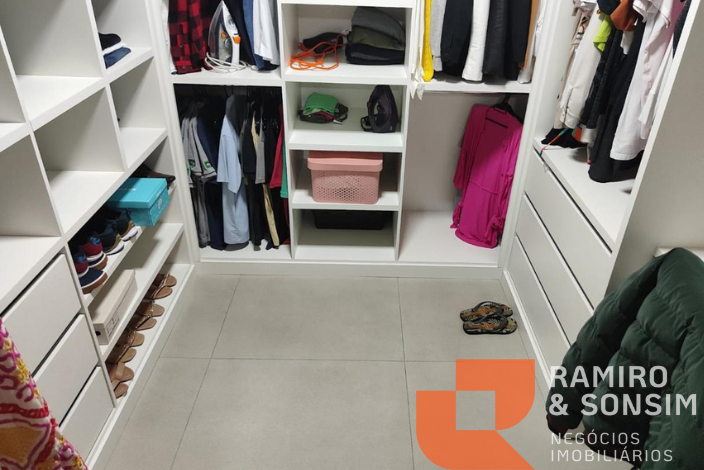 Suíte master com closet e móveis planejados, oferecendo conforto e elegância