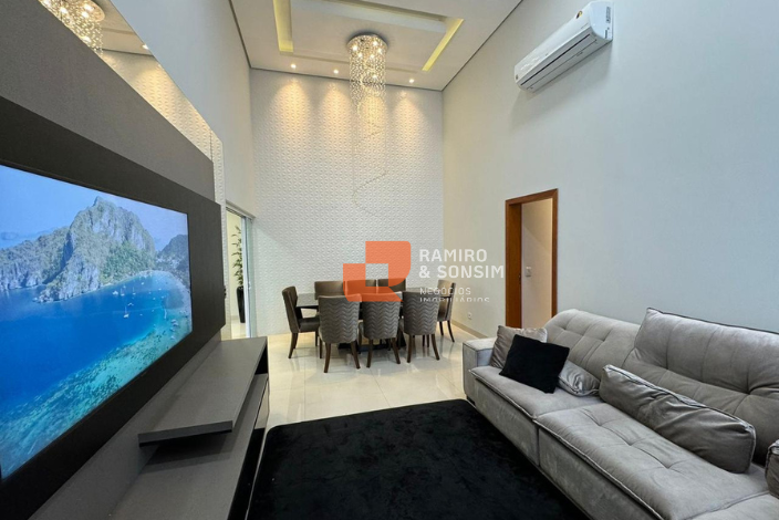 Sala de estar e jantar integradas com pé direito alto, trazendo sofisticação e iluminação natural